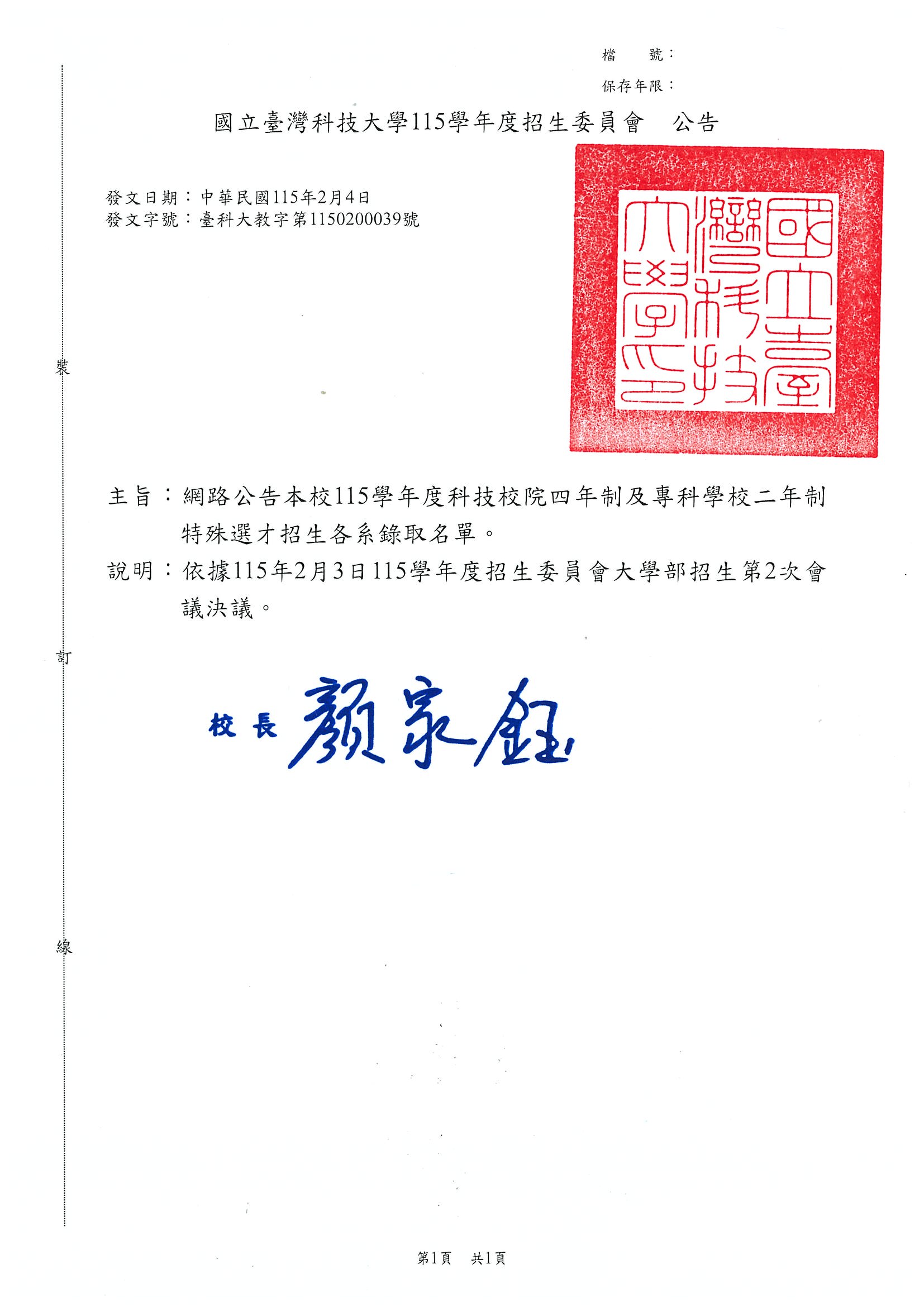 - 考生可於115 年 2 月 11 日 (星期三) 10:00起至四技二專特殊選才入學聯合招生委員會網站查詢分發結果。